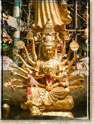 steht hier oben eine große goldgewandte Statue, die „Goddess of Mercy“ übersetzt die chinesische Gottheit Kuan Yin.