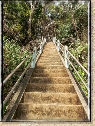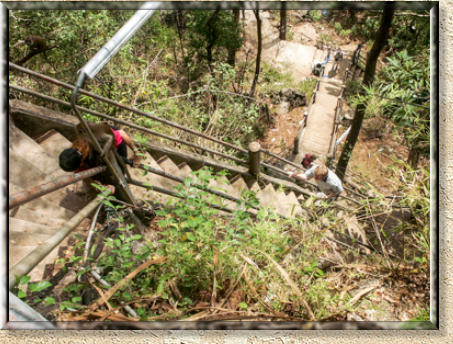 Wieder zurück aus dem Tal, steigen wir einen steilen Treppenaufgang mit 1237 unterschiedlich hohen Stufen hinauf, der uns zum