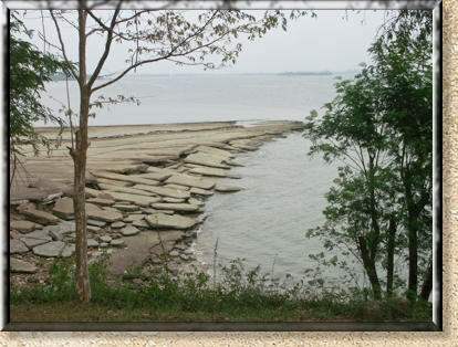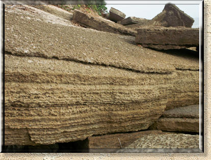 Eine flache Felsbank am Ufer entlang, gebildet aus kleinen, versteinerten Schnecken und Muscheln, die zwischen 20 und 40 Millionen
