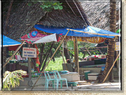 Wenige Meter zurückgesetzt vom Strand kann man Massagen für wenig Geld bekommen, doch auch hier muss man währenddessen den